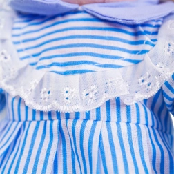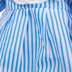 Rochia în dungi alb‑albastre cu dantelă decorativă se îmbracă și se dezbracă ușor – susține autonomia și motricitatea fină.
