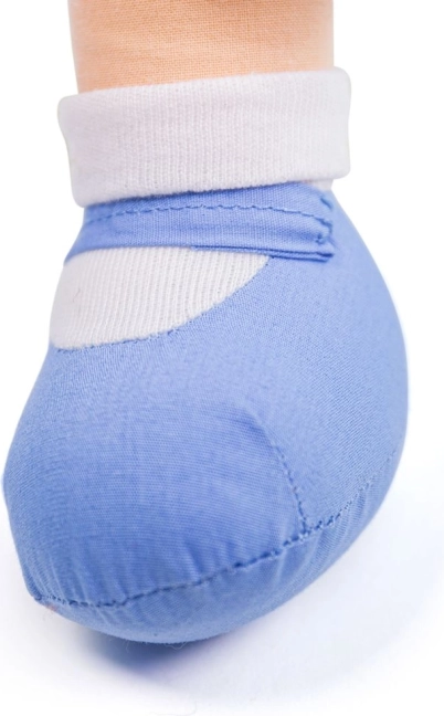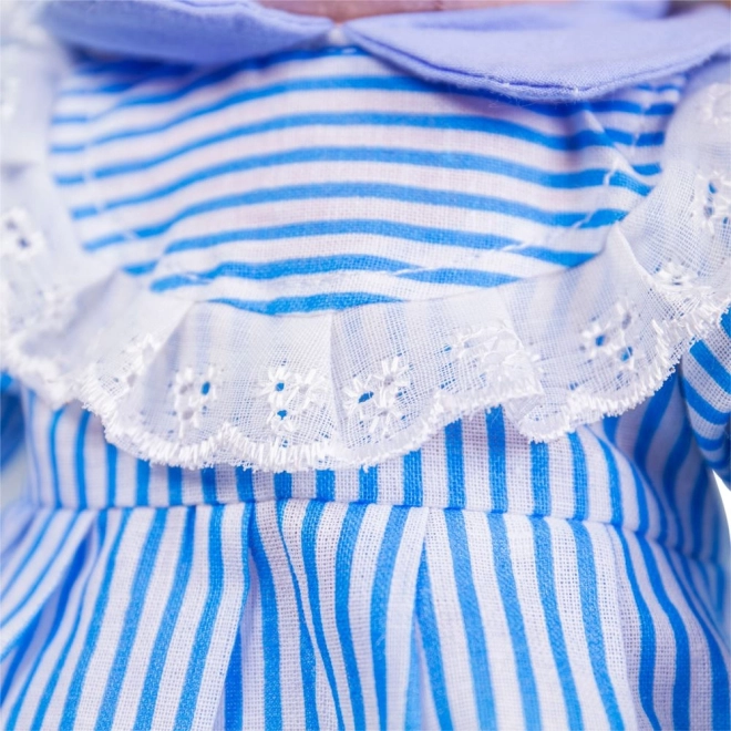 Amelia este o păpușă textilă catifelată, cu codițe castanii din fir, rochiță în dungi alb‑albastre și un zâmbet prietenos. Este concepută pentru îmbrățișări sigure încă din primele zile, sprijină dezvoltarea motricității fine și a empatiei și este perfectă pentru primele jocuri de îngrijire.