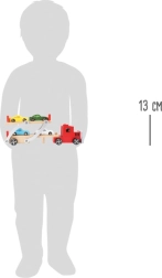 Oferiți-le copiilor distracție realistă cu transportorul auto din lemn, care poate duce patru mașinuțe sport colorate. Cuplați remorca la capul tractor, rabatați platforma superioară și conduceți vehiculele pe rampă cu ușurință. Bariera de pe platforma ridicată previne rularea accidentală înapoi – totul este pregătit pentru călătorii lungi și sigure.