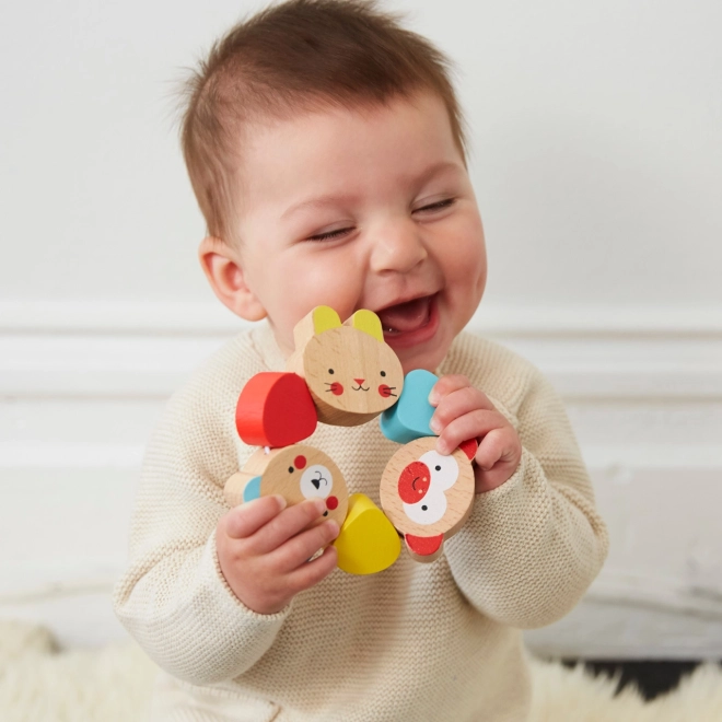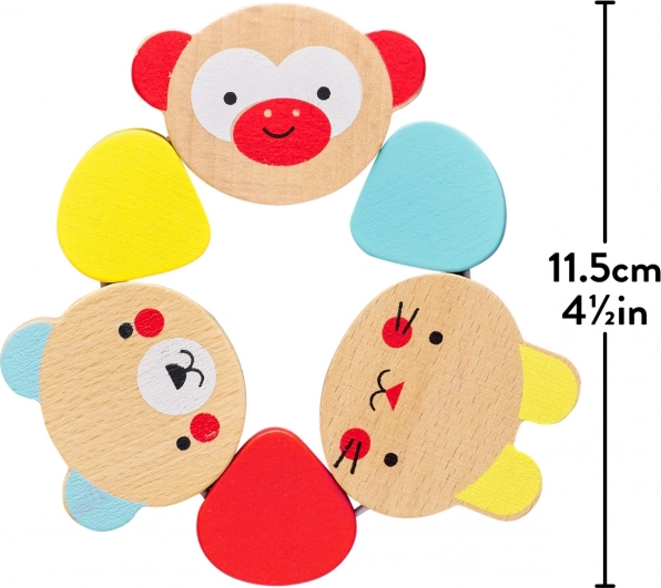 Jucăria din lemn este proiectată pentru a se potrivi în mâinile mici care se bucură de explorarea în siguranță a diferitelor texturi și forme. Este perfectă pentru creșterea dinților de lapte, datorită materialelor naturale folosite și culorilor pe bază de apă, asigurând siguranța în utilizare.