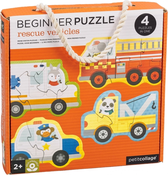 Un set drăguț de patru puzzle-uri cu motive cu vehicule de salvare îi va bucura pe micii constructori încă de la 2 ani. Fiecare mini-puzzle are un nivel diferit de dificultate (3–6 piese), astfel încât copiii progresează pas cu pas. Fabricat din carton reciclat și imprimat cu cerneluri pe bază de plante. Include o cutie de depozitare practică pentru transport și depozitare ușoare.