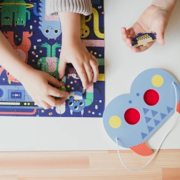 După asamblarea imaginii, pe micii detectivi îi așteaptă o misiune: pot găsi 5 dulciuri, 4 obiecte cu roți, 3 pălării, 2 instrumente muzicale și 1 lucru urât mirositor? Datorită materialelor de calitate din hârtie certificată FSC și imprimării cu culori netoxice, jocul este sigur și prietenos cu mediul.