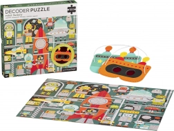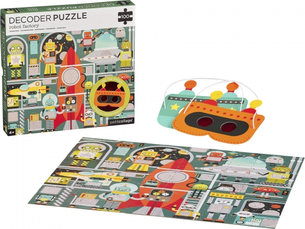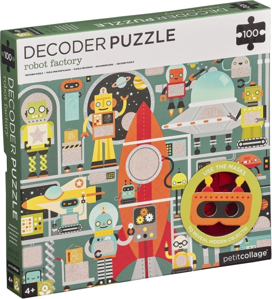 Intrați în lumea roboților și a fabricii lor! Asamblați puzzle-ul din 100 de piese și, cu ajutorul măștii speciale de decodare, descoperiți detalii ascunse necesare pentru finalizarea navei spațiale. Acest accesoriu ingenios transformă asamblarea într-un joc interactiv care dezvoltă logica, spiritul de observație și motricitatea fină.