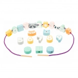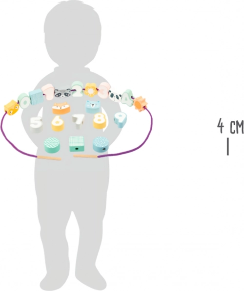 Capătul din lemn al șnurului facilitează înșirarea și consolidează coordonarea mână–ochi și dexteritatea degetelor.