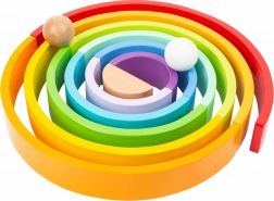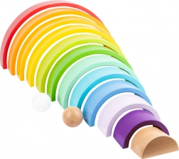 Acest curcubeu mare din lemn oferă zeci de moduri de joacă: de la construirea de turnuri și poduri, la crearea de piste pentru bile și provocări de echilibru. Copiii învață natural culorile, dimensiunile și sortarea, își antrenează coordonarea mână–ochi și își dezvoltă gândirea logică.