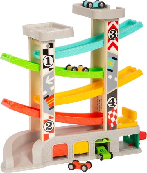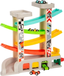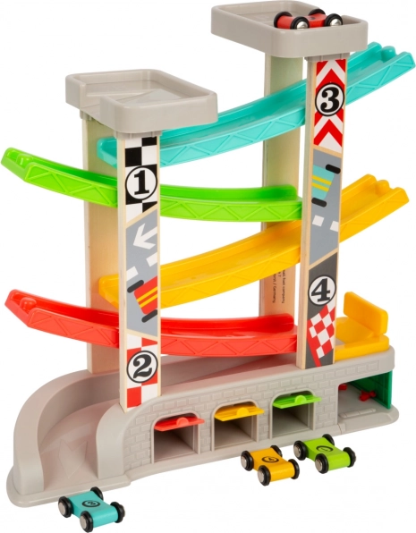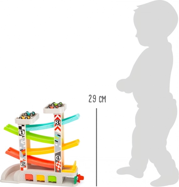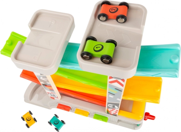 Pista de curse include niveluri diferite și mașinuțe colorate, ceea ce asigură o joacă distractivă și educativă.