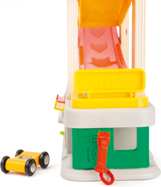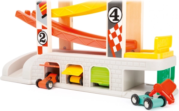 Prezentăm pista de curse care garantează ore de distracție pentru copiii dumneavoastră. Acest set include nu doar pista de curse, ci și trei garaje și o stație de alimentare, permițând simularea diferitelor scenarii și jocuri. Datorită culorilor sale unice, pista atrage ușor atenția și stimulează curiozitatea copiilor. Construcția robustă îmbină piese din plastic și lemn atractiv imprimate, asigurând durabilitate îndelungată.