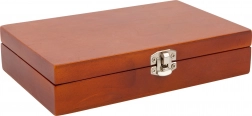 Cutia robustă din lemn cu închizătoare metalică protejează atât cărțile, cât și zarurile. Încape ușor în rucsac sau valiză.
