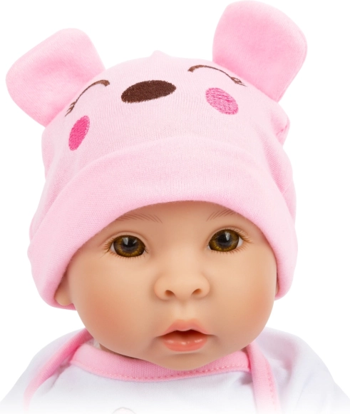 Corpul textil este ușor și catifelat, ideal pentru copiii mai mici. Păpușa se poartă ușor și invită la alint și la joaca zilnică.