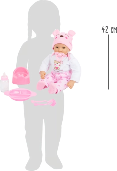 Setul bogat de accesorii include suzetă, biberon, farfurioară cu tacâmuri și oliță în culori asortate. Copiii pot exersa hrănirea, schimbarea și obiceiurile de igienă prin joc de rol distractiv. Hăinuțele sunt concepute pentru îmbrăcare ușoară, astfel încât păpușa este ușor de manevrat chiar și cu mânuțe mici.