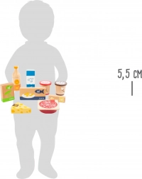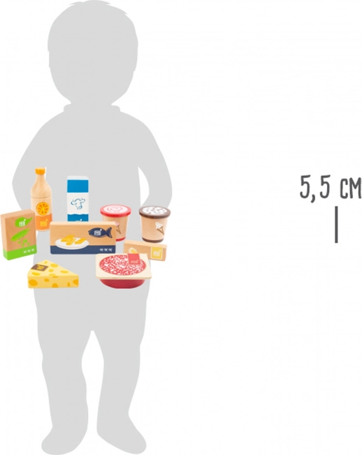Setul conține suc de portocale, două cutii de înghețată, un pachet de mazăre, bastonașe de pește, unt, brânză, salam feliat și o cutie de lapte. Imprimările realiste și aspectul natural atrag de la prima vedere. Datorită lemnului solid, setul este durabil și pregătit pentru joaca zilnică.