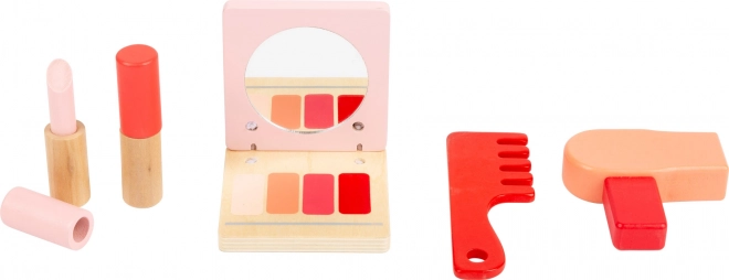 Setul din lemn include diverse instrumente pentru îngrijirea frumuseții care inspiră copiii la jocuri creative și dezvoltarea abilităților lor.