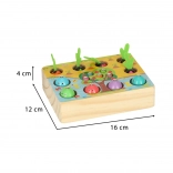 Duceți copilul într-o expediție la iaz și în grădină – fără să părăsiți casa. Baza de joc din lemn masiv ascunde orificii pentru peștișori, râme și morcovi colorați. Copiii îi prind cu undița magnetică sau îi scot trăgând de frunzele din fetru, antrenând în mod natural priza și finețea degetelor.