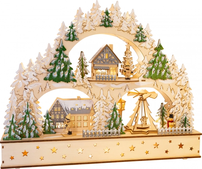 Descoperă magia Crăciunului cu arcada din lemn SMALL FOOT, care înfățișează un sat de iarnă pitoresc, cu căsuțe, copaci și personaje. Detaliile fin decupate și aspectul natural al lemnului, cu accente albe și verzi, arată elegant și atemporal în orice interior.