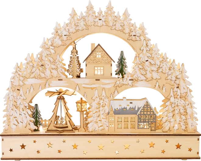 Aspectul artizanal, decupajele precise ale copacilor și căsuțelor și tonul natural al lemnului transformă arcada într-un punct de atracție al decorațiunii de Crăciun, atât la fereastră, cât și pe comodă.