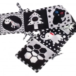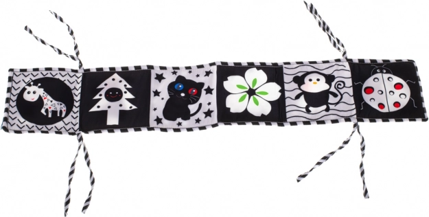 Cartea senzomotorie contrastantă, proiectată ca protecție pentru pătuț, este alegerea perfectă pentru copiii care încep să descopere lumea. Cartea în formă de armonică poate fi ușor fixată de pătuț cu ajutorul șnururilor, oferind nu doar distracție, ci și siguranță.