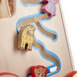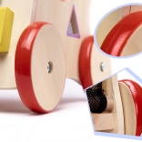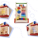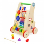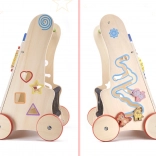 Toate părțile mersului sunt atent șlefuite pentru a proteja mâinile mici de așchii și vopsite cu culori netoxice, ecologice. Construcția este stabilă, cu roți din lemn acoperite cu cauciuc pentru o siguranță sporită. Mersul are pe laterale și un sortator de forme cu patru cuburi colorate și un labirint cu animăluțe drăguțe.