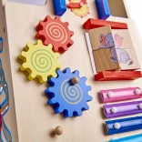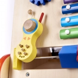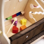 Pe partea frontală se află un panou plin de elemente interactive pentru dezvoltarea simțurilor copilului, inclusiv ceas, roți dințate și țambale.