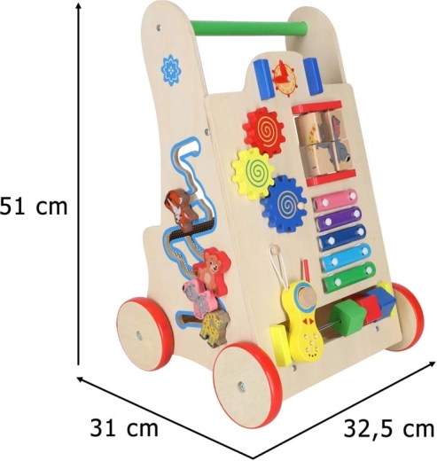 Descoperiți premergătorul multifuncțional din lemn 6 în 1, care combină sprijinul la mers cu un centru educativ într-un singur produs. Panoul frontal oferă activități variate: limbi de ceas mobile, roți dințate rotative, un mic xilofon cu baghetă, elemente glisante și imagini rotative. Părțile laterale sunt completate de sortarea formelor și un distractiv labirint cu animăluțe. Datorită construcției stabile și roților cu cauciuc antiderapant, mersul este mai sigur și mai încrezător.
