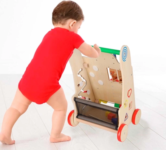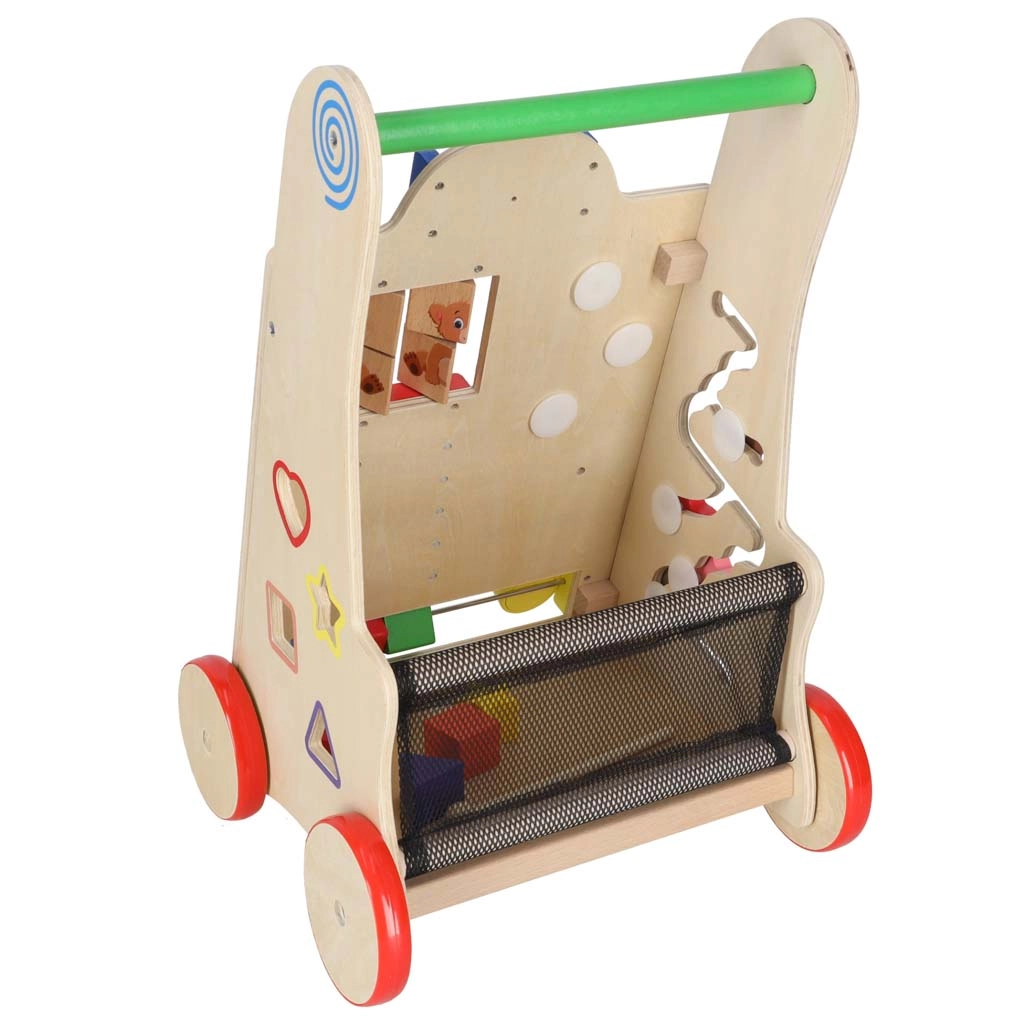 Structura solidă din lemn și roțile cu cauciuc antiderapant îi ajută pe copii să exerseze mersul cu mai multă siguranță și echilibru.