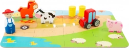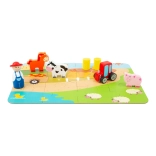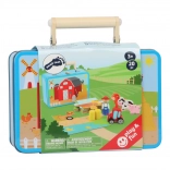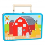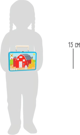 Porcușorul guiță, tractorul huruie. Joc portabil într-o valiză frumoasă; copiii își pot crea propria fermă datorită figurinelor de joc sub formă de tractor, animale domestice și fermier din lemn. Așadar, mai întâi construiți baza din puzzle și apoi puteți începe să vă jucați! Ferma este desăvârșită de figurinele baloților de fân. Cufundați-vă în viața de la țară și lăsați-vă imaginația să zboare. Valiza este din metal rezistent, mânerul este din lemn, încuietoarea se deschide ușor. Potrivită pentru camerele copiilor, săli de joacă... Principalele caracteristici: conține 12 piese de puzzle și figurine: fermier, tractor, purcel, văcuță, căluț și baloți de fân; ambalaj practic – valiză metalică cu mâner din lemn
