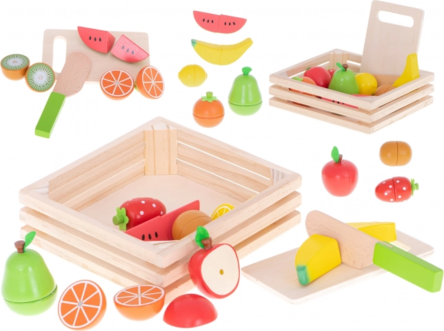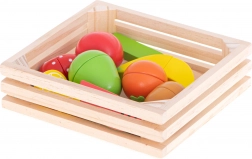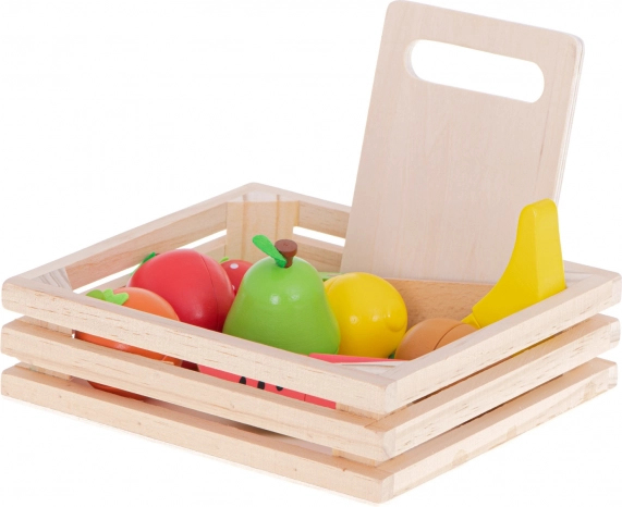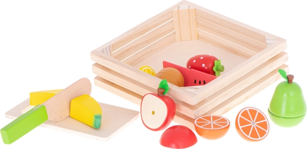 Fructe colorate în cutie de lemn, care permit prepararea unei salate delicioase de fructe pentru toate păpușile și jucăriile de pluș.