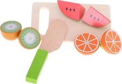 Fructele pot fi tăiate în bucăți mai mici folosind cuțitul de jucărie inclus în set. Pune-le pe placa de tăiat și separă-le. Fructele colorate atrag atenția și mâinile mici... ca un magnet! Bucățile separate se pot reuni cu ușurință, deoarece piesele sunt echipate cu magneți, iar distracția începe din nou!