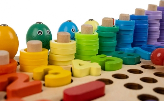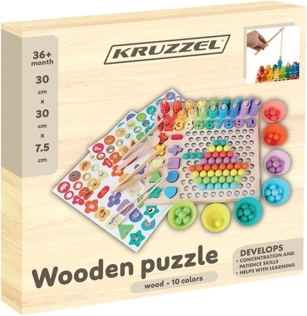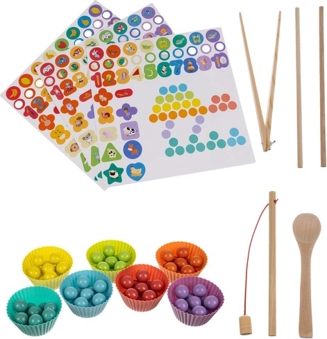 Acest set educațional complex din lemn combină mozaicul cu mărgele, asamblarea formelor și pescuitul magnetic. Copiii exersează într-un mod ludic număratul, sortarea culorilor și recunoașterea formelor, dezvoltând totodată motricitatea fină și prinderea cu ajutorul pensetei, bețișoarelor și linguriței. Potrivit pentru joacă independentă sau învățare împreună cu părinții.