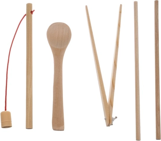 - bază și elemente din lemn: tei/lemn; bile: lemn; inele: PE; cifre, forme geometrice și semne matematice: MDF; peștișori: lemn + fier; formețe: PE; carduri față-verso: hârtie; bețișoare: lemn; pensetă: lemn; linguriță: lemn; undiță: lemn + PP + PS + magnet