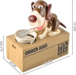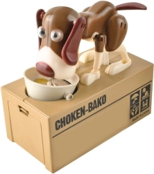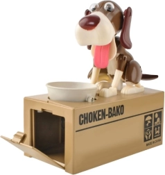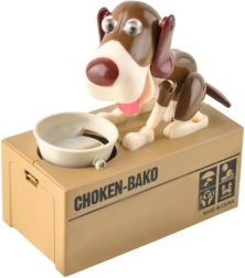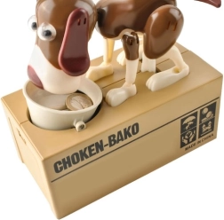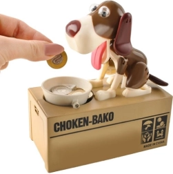 Pușculiță interactivă amuzantă CHOKEN-BAKO în formă de cățel care „mănâncă” monede din bol. O modalitate excelentă de a învăța copiii să economisească prin joacă. După introducerea monedei, câinele se mișcă și scoate sunete – înghite moneda în cutie. Funcționează cu 2× baterii AA. Dimensiunile compacte și execuția sigură din plastic ABS/PS fac din această pușculiță un accesoriu stilat pentru camera copiilor și un cadou original. Îi învață pe copii să economisească, mișcare și sunet realiste, extrageți monedele cu ușurință.