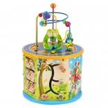 Partea superioară, cu labirintul de mărgele, poate fi folosită pentru antrenarea prinderii și a motricității fine, iar panourile laterale oferă sortator de forme, roți dințate, abac, numere, labirint și alte activități. Partea inferioară ascunde jocul de masă „Nu te supăra, frate” cu pioni și zaruri incluse – ideal pentru distracție în familie.