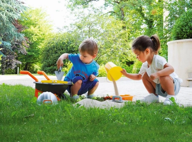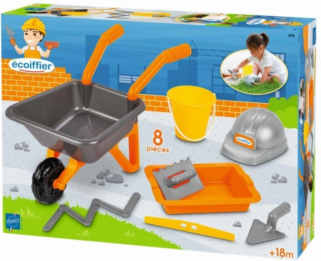 Super-set pentru șantiere de nisip, 8 piese. Roabă, găleată, nivelă cu bulă, metru pliant, mistrie de zidar, drișcă, bol și cască de protecție.