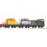 Garnitura include un mix de vagoane de marfă DB din era III – vagon acoperit, vagon platformă și cisterne – pentru compuneri variabile și scenarii realiste de marfă pe traseul dumneavoastră.