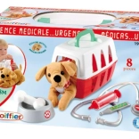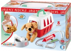 Gentuță compactă pentru micul veterinar, cu un cățel drăgălaș și accesorii practice. Poate servi drept cutie de transport și spațiu de depozitare sigur pentru toate ustensilele. În pachet găsiți un bol, un os și echipament medical de bază. Dimensiunile gentuței: 24 × 15 × 14 cm.