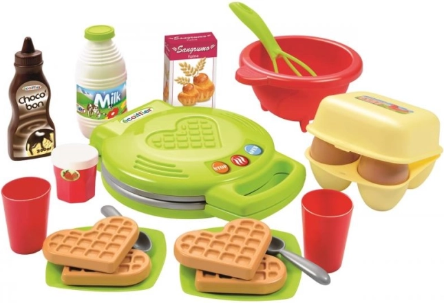 Setul pentru preparare vafe include toate accesoriile necesare pentru a pregăti 4 vafe în formă de inimă pentru cei mici.