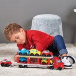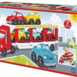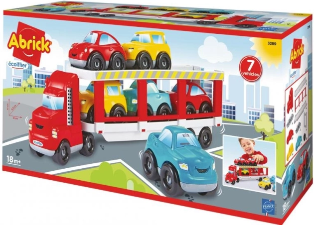 Transportor Abrick atractiv pentru transportul mașinuțelor! Transportorul este echipat cu o rampă rabatabilă, care permite încărcarea și descărcarea a șase mașinuțe colorate cu ușurință.