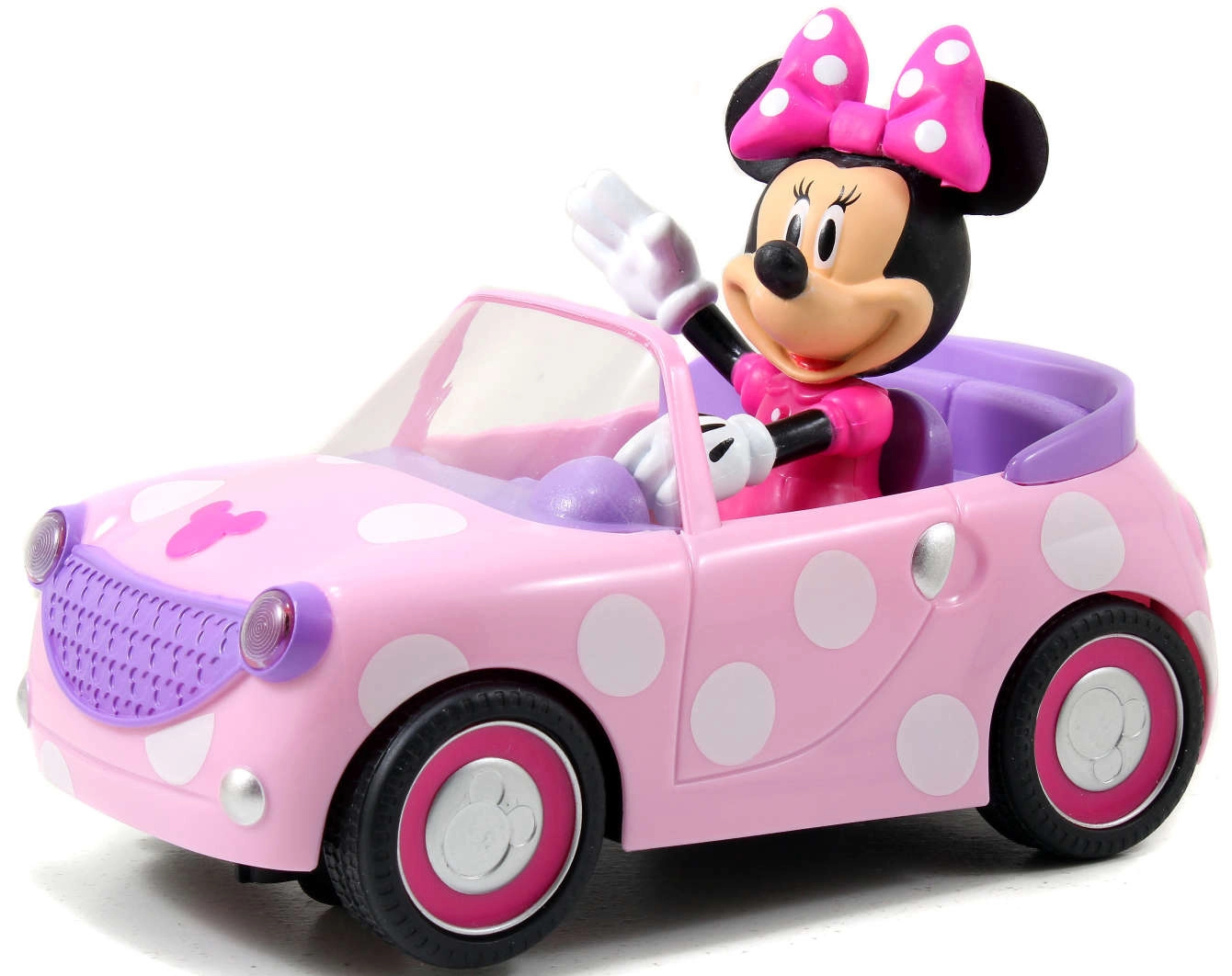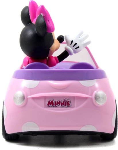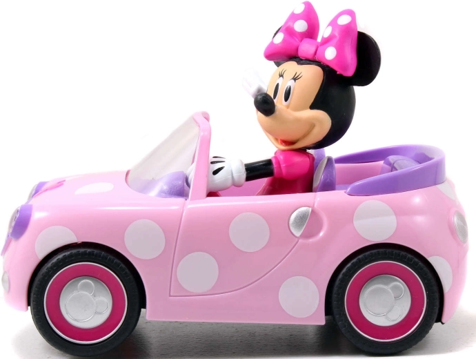 Cabrioletul roz cu buline și figurina MINNIE MOUSE integrată fix stimulează imaginația și jocul tematic.