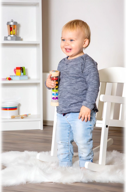 Acest baston de ploaie îmbină lemnul natural și plasticul rezistent într-o jucărie sigură și atrăgătoare pentru cei mici. Prin înclinare sau scuturare se creează un sunet autentic de ploaie fină, care liniștește simțurile copiilor și adulților. Cilindrul transparent dezvăluie biluțe viu colorate și segmente în formă de floare, făcând jocul captivant vizual.