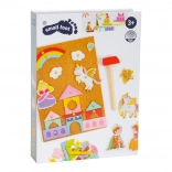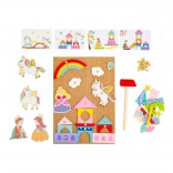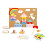 Scufundați-vă în lumea magică a distracției creative cu Jocul de bătut cuie Unicorn. Acest joc le permite copiilor să creeze diverse scene și povești folosind ciocănelul inclus și formele din lemn colorate. Setul conține și modele care îi pot inspira pe copii să realizeze imagini de basm.