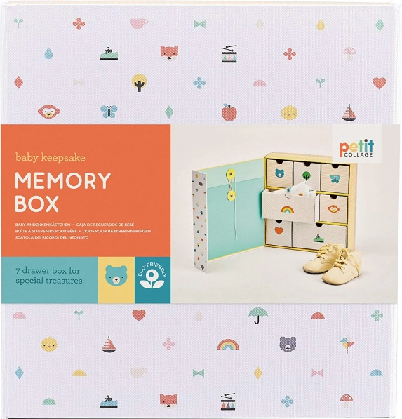 Cutia este realizată din materiale reciclate și ambalată fără plastic, subliniindu-i grija față de natură. Dimensiunile compacte facilitează plasarea pe raft sau în dulap, oferind în același timp suficient spațiu pentru primii botoșei, fotografii, felicitări și alte mici daruri.