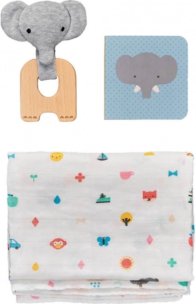 Set cadou stilat și sustenabil pentru cei mai mici, cu motiv de elefant, care va bucura orice părinte proaspăt. Conține o jucărie de ros din lemn de fag certificat FSC, un muselin/șal moale din bumbac organic și o cărticică ilustrată rezistentă. Ambalajul este fără plastic și are în vedere siguranța, confortul și dezvoltarea senzorială a bebelușului încă de la naștere.