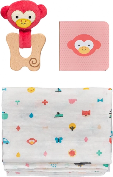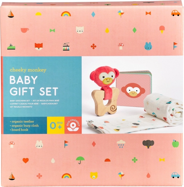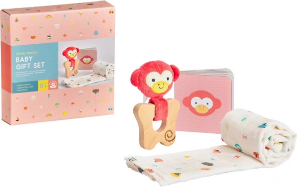 Un set cadou stilat pentru nou-născuți cu motiv de maimuțică de la PETIT COLLAGE, care încântă prin accesorii practice și grijă față de natură. Conține un inel de dentiție din lemn de fag FSC, un șal moale din bumbac organic și o cărțulie ilustrată din carton. Ambalajul este complet fără plastic, iar materialele provin din surse durabile.