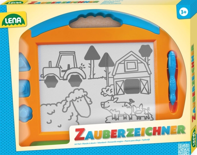 Această tablă magnetică este jucăria ideală pentru primele desene și învățarea formelor. Datorită barei glisante practice, imaginea poate fi ștearsă într-o clipă și se poate începe din nou – fără mizerie și fără hârtie. Stylusul cu vârf metalic este prins cu un șnur, astfel încât nu se pierde, iar cele trei ștampile magnetice ajută la crearea unor modele distractive.