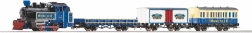 Locomotivă cu abur 0-4-0, vagon de călători, vagon acoperit și vagon descoperit – toate în designul unitar al circului pentru o operare atractivă pe traseu.