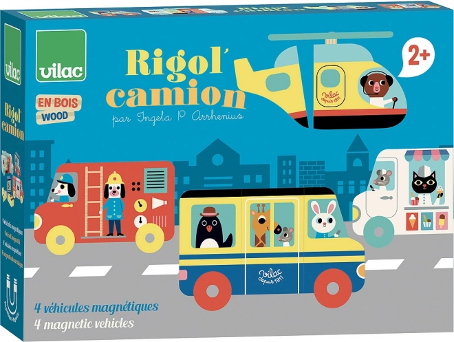 Patru vehicule diferite cu părți magnetice le permit copiilor să asambleze combinații corecte sau hazlii, stimulând creativitatea și gândirea logică.