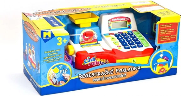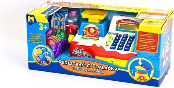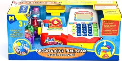Pușculiță/casă de marcat îndrăgită cu sertar glisant pentru bani, butoane funcționale, microfon, cântar, coș și o serie de produse alimentare de jucărie pentru micii comercianți. Produs pe baterii. Potrivit pentru copii de la 3 ani.