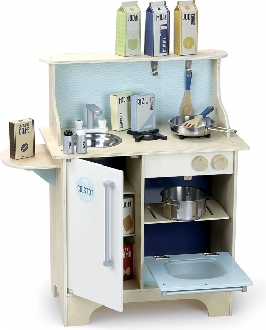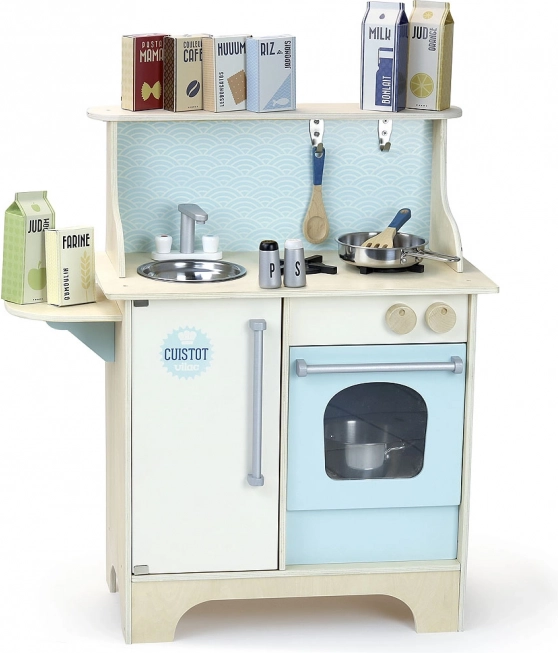 Această bucătărie albastră din lemn VILAC Cuistot transformă orice cameră de copii într-un mic studio culinar. Copiii vor iubi detaliile realiste, precum aragazul cu rotițe care fac clic, chiuveta și cuptorul, și se vor bucura de ore întregi de joacă creativă cu setul bogat de accesorii.