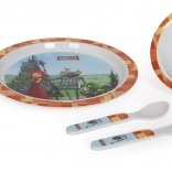 Acest set de masă aduce bucurie în orice cameră de copil. Este fabricat din plastic de calitate, asigurând o rezistență ridicată și întreținere ușoară – poate fi spălat în mașina de spălat vase. Copiii vor iubi designul cu îndrăgitul cavaler Rusty, care transformă fiecare masă într-o aventură. Setul conține: