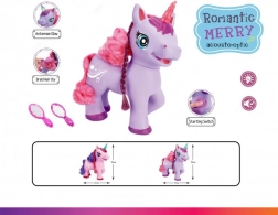 Un drăgălaș unicorn mov cu baterii îi va încânta pe copii cu efectele sale – la apăsarea butonului de pe burtică începe să cânte un cântec în limba engleză, scoate sunete magice și cornul i se luminează. Setul include un pieptene și o oglindă pentru pieptănarea coamei lungi.