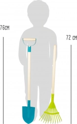 Lopata măsoară 76 cm, grebla 72 cm. Dimensiunile sunt adaptate mâinilor copiilor pentru o muncă sigură și plăcută în grădină.